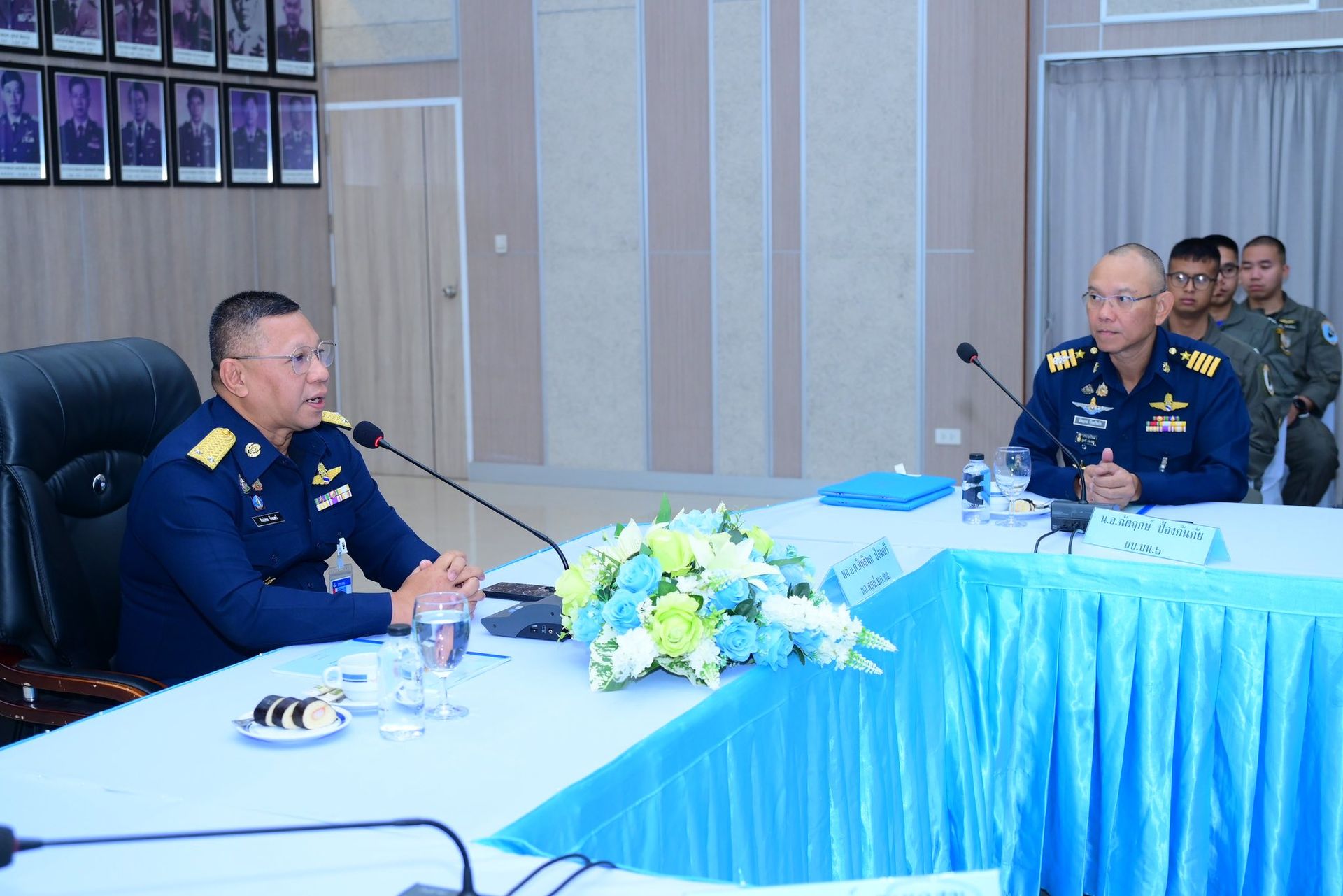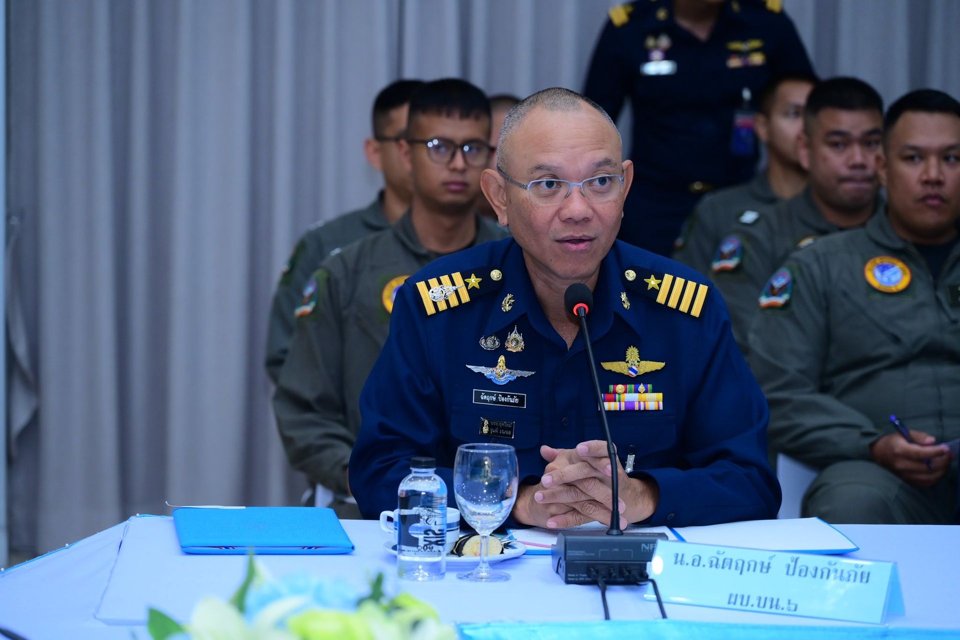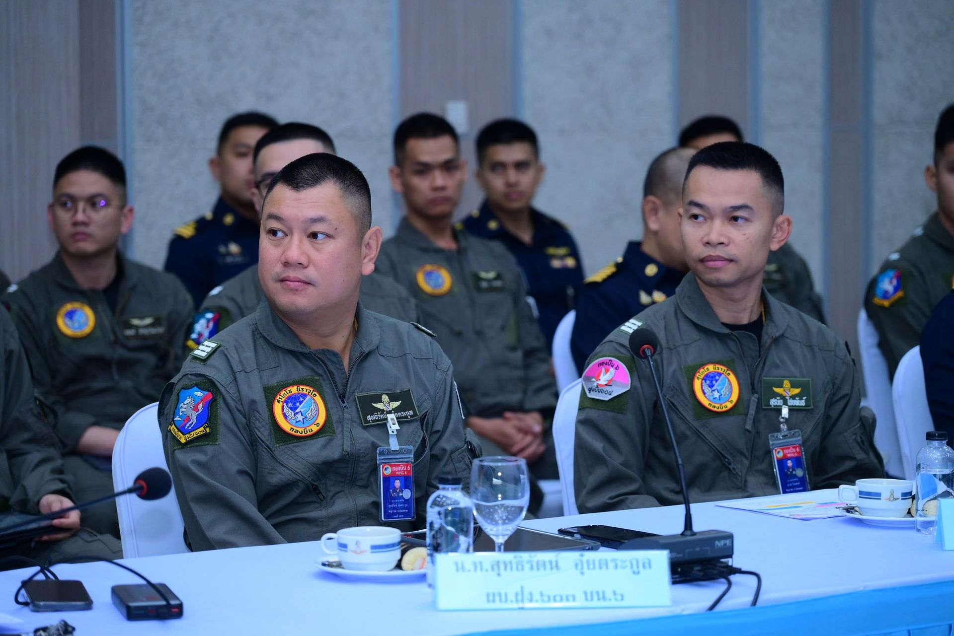 อากาศนาวาอากาศเอก ฉัตฤกษ์ ป้องกันภัย ผู้บังคับการกองบิน ๖ พร้อมด้วยรองผู้บังคับการกองบิน ๖ และเสนาธิการกองบิน ๖ ให้การต้อนรับพลอากาศตรี สิทธิพล ป้อมตรี ผู้อำนวยการสำนักการฝึก กรมยุทธการทหารอากาศ ในฐานะหัวหน้าคณะตรวจเยี่ยม และคณะตรวจเยี่ยม เนื่องในโอกาสเดินทางมาตรวจเยี่ยมรับฟังการบรรยายสรุป หารือข้อขัดข้อง และมอบนโยบายในการปฏิบัติงานด้านยุทธการของฝ่ายอำนวยการ กองบิน ๖ โดยมีผู้บังคับฝูงบินกองบิน ๖ หัวหน้าหน่วยขึ้นตรงกองบิน ๖ และข้าราชการกองบิน ๖ เข้าร่วมประชุม ณ หอประชุมธูปะเตมีย์ กองบิน ๖