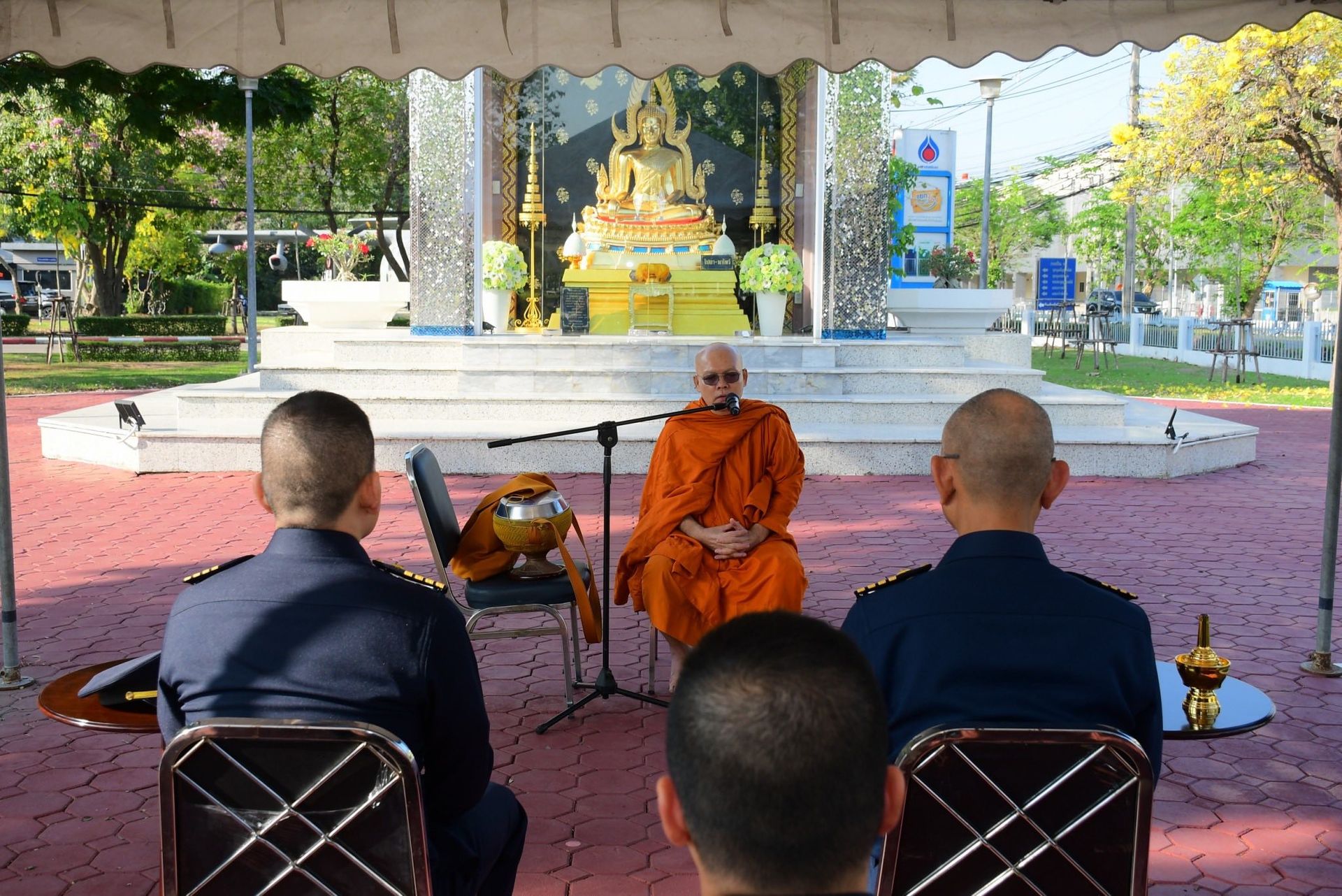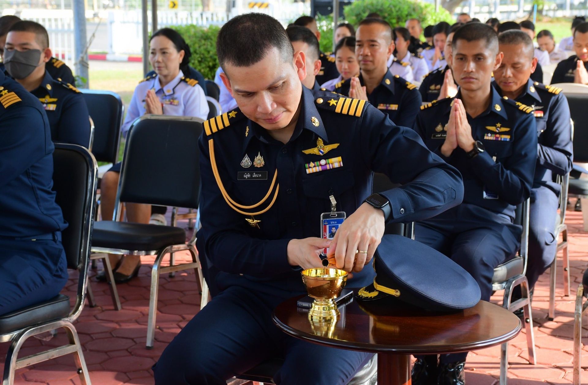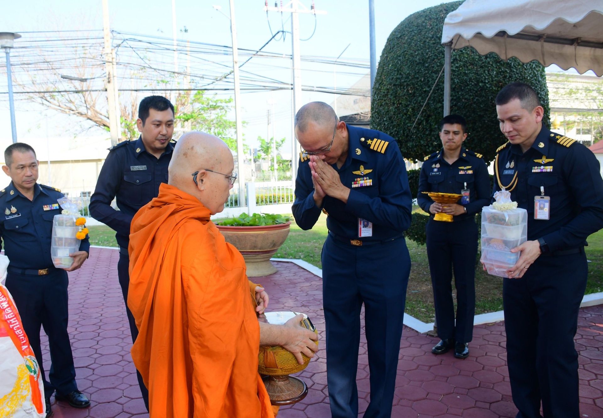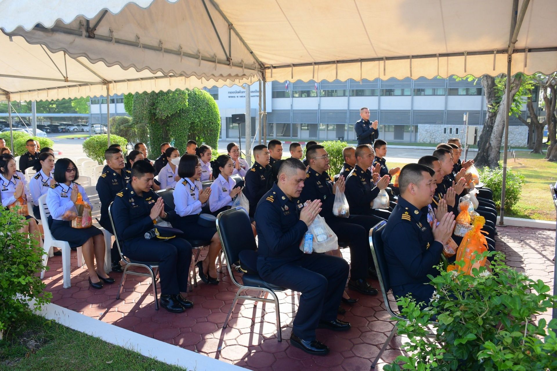 นาวาอากาศเอก ฉัตฤกษ์ ป้องกันภัย ผู้บังคับการกองบิน ๖ พร้อมด้วยเสนาธิการกองบิน ๖ นำหัวหน้าหน่วยขึ้นตรงกองบิน ๖ และข้าราชการ
