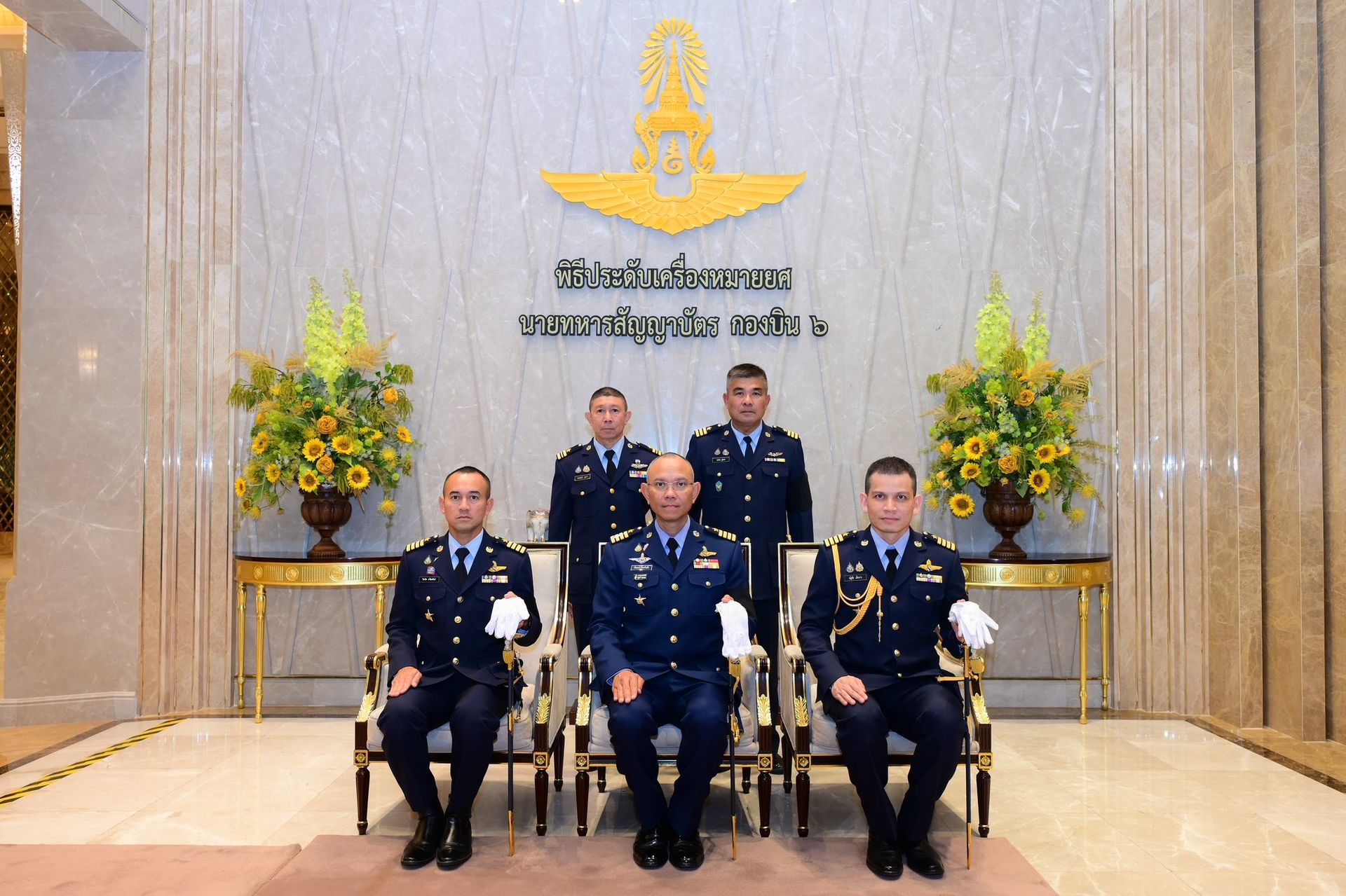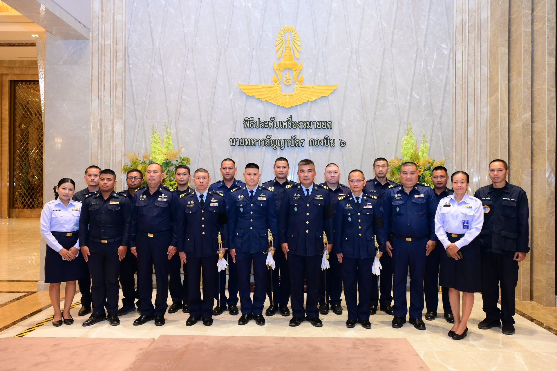 นาวาอากาศเอก ฉัตฤกษ์ ป้องกันภัย ผู้บังคับการกองบิน ๖ เป็นประธานในพิธีประดับเครื่องหมายยศให้แก่ นายทหารสัญญาบัตร สังกัดกองบิน ๖ ที่ได้รับการพระราชทานยศสูงขึ้น โดยมีรองผู้บังคับการกองบิน ๖ เสนาธิการกองบิน ๖ และหัวหน้าหน่วยขึ้นตรงกองบิน ๖ ร่วมเป็นเกียรติในพิธีณ อาคารรับรองบุคคลสำคัญ (แกรนด์ฮอลล์) ท่าอากาศยานทหาร ๒ กองบิน ๖ เมื่อวันที่ ๖ กุมภาพันธ์ ๒๕๖๙